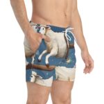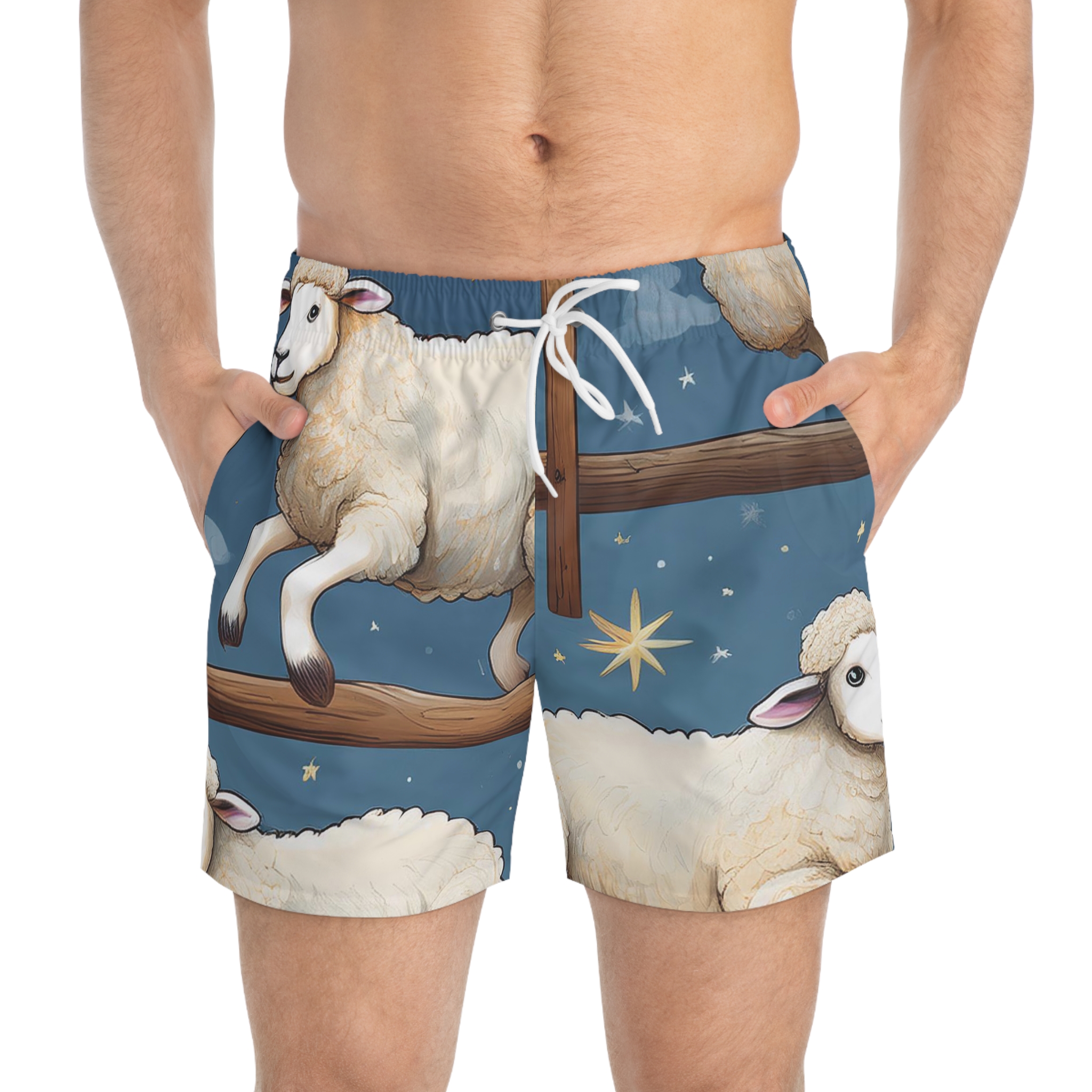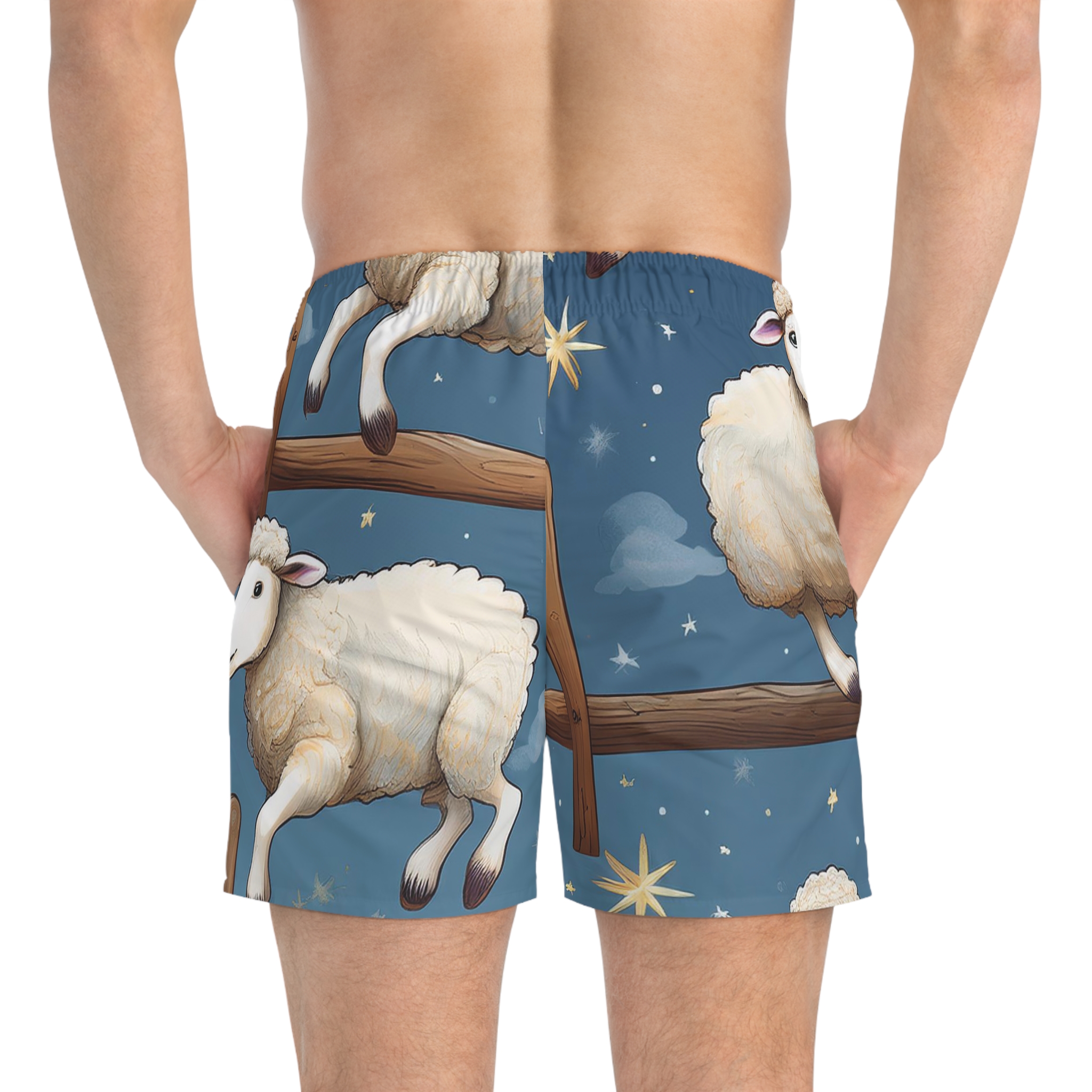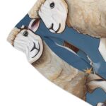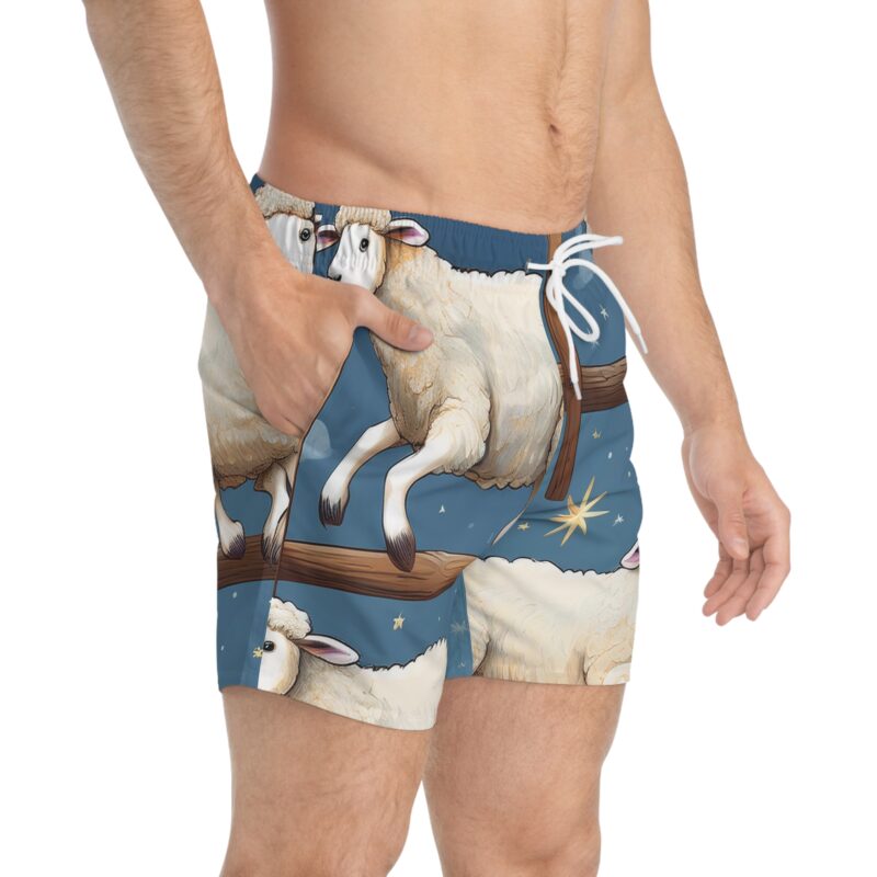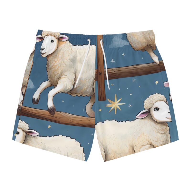 Take the plunge and make a splash—no need to be sheepish about it! These all-over print swim trunks bring a whole new meaning to counting sheep, featuring a whimsical design of fluffy jumpers soaring over fences under a starlit night sky. Whether you’re diving into the waves, floating in the pool, or just lounging on the shore, these trunks are woolly cool and packed with comfort.