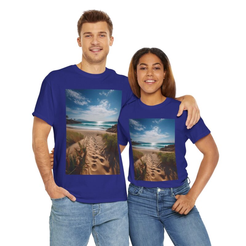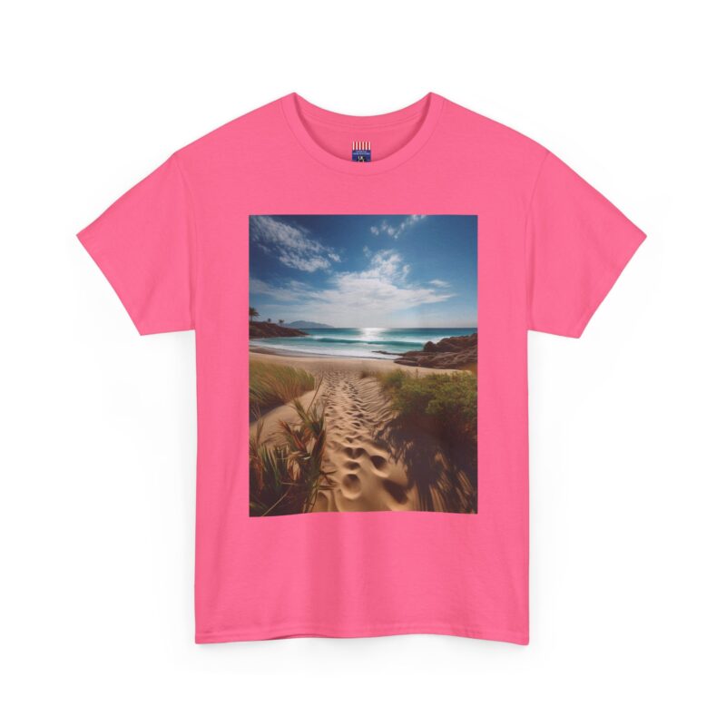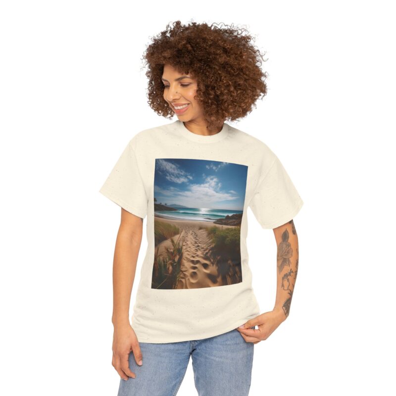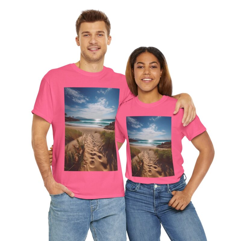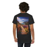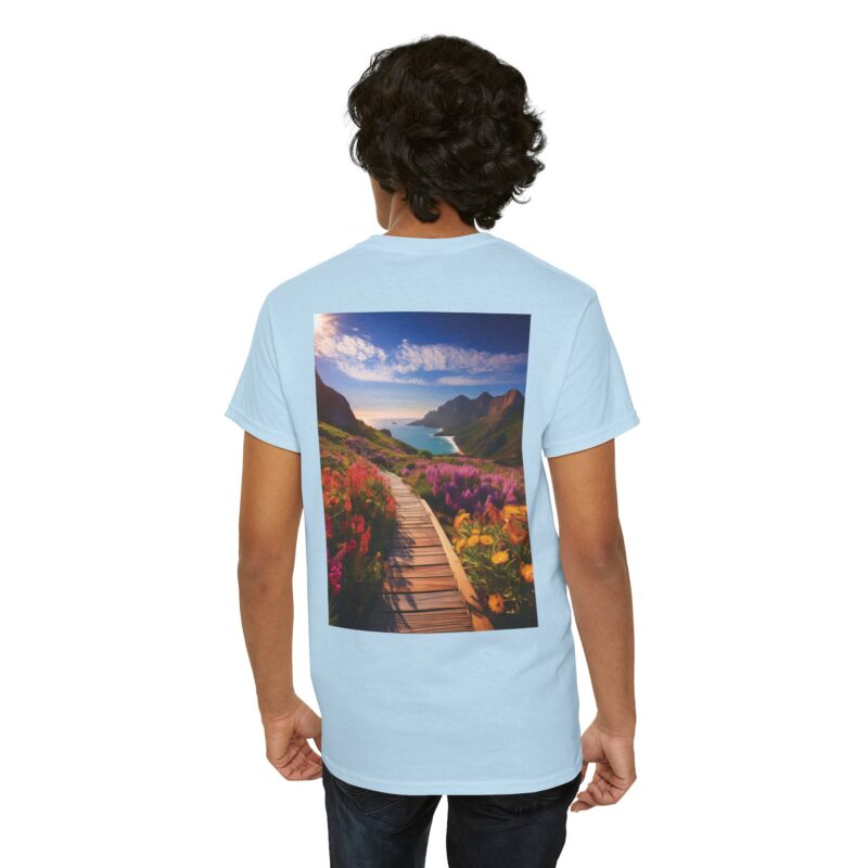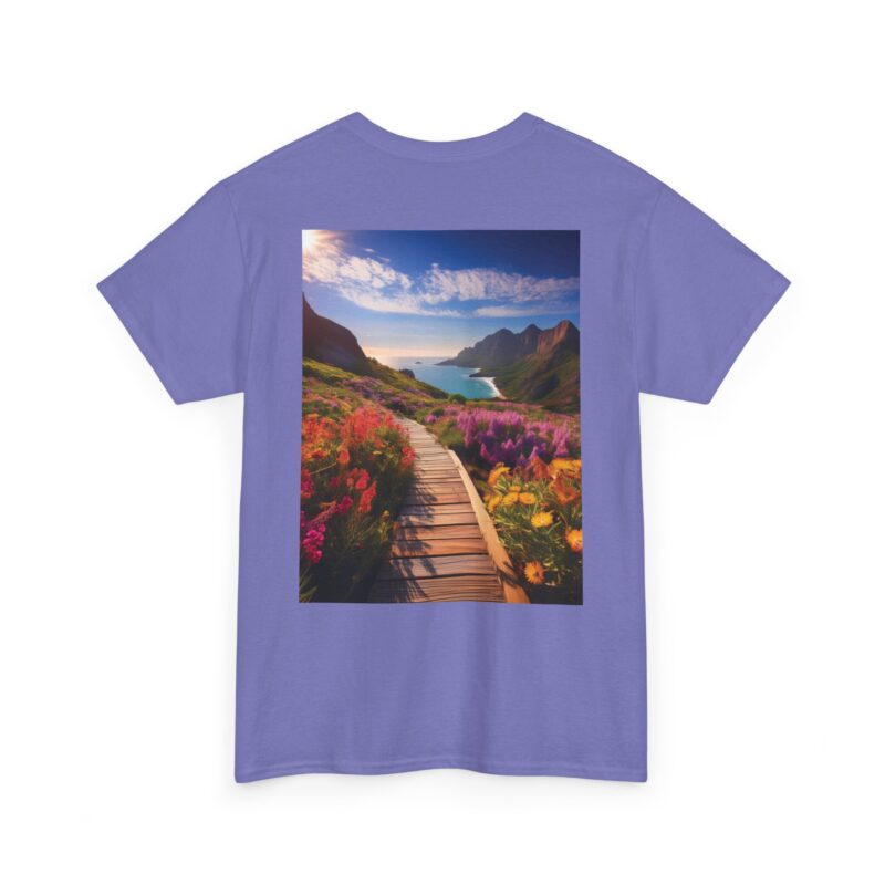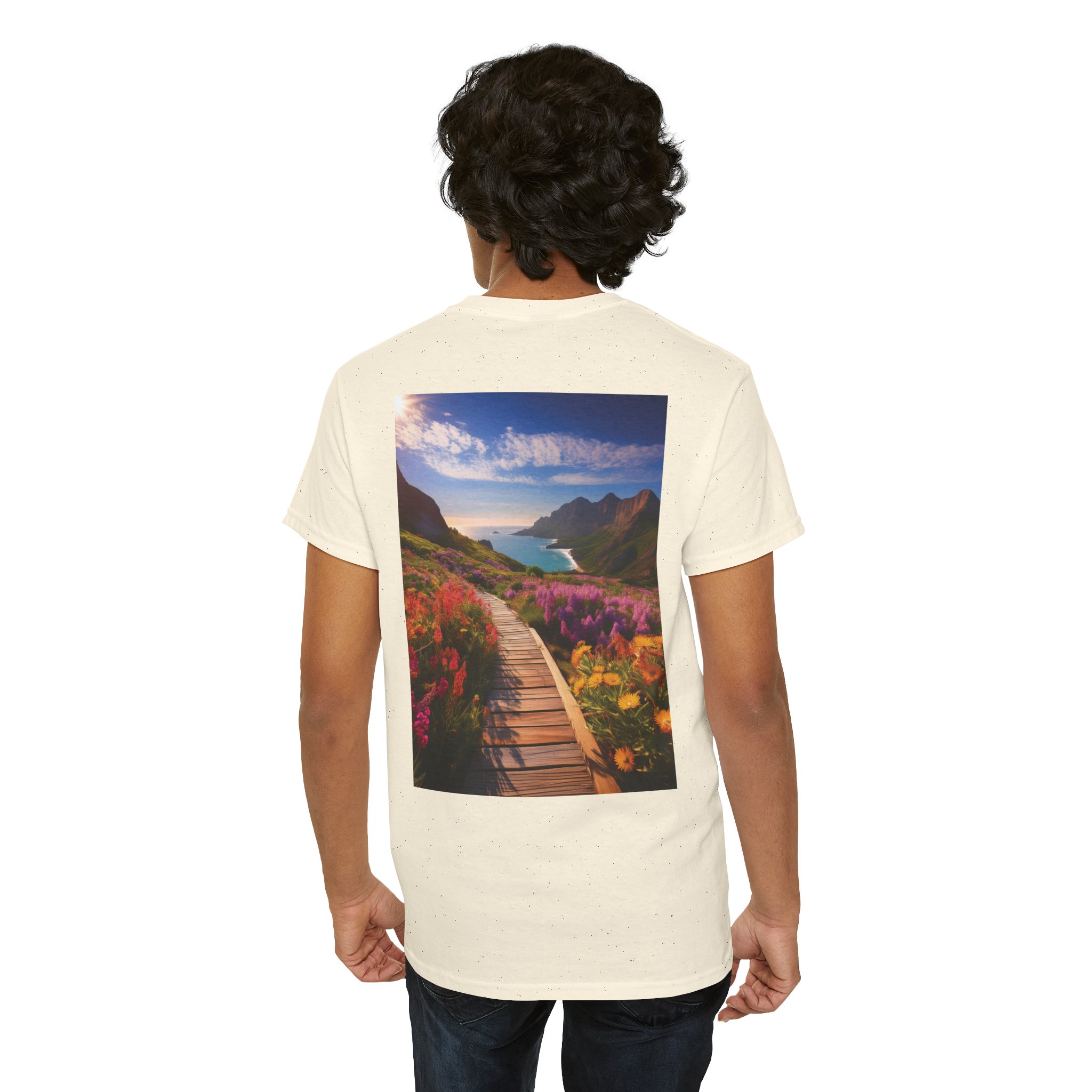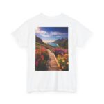 Turn heads with the captivating back print, showcasing a vibrant wooden boardwalk meandering through a meadow bursting with wildflowers, all leading to a majestic seaside view. The vivid colors and dynamic composition evoke a sense of exploration and adventure, making this tee a wearable masterpiece.