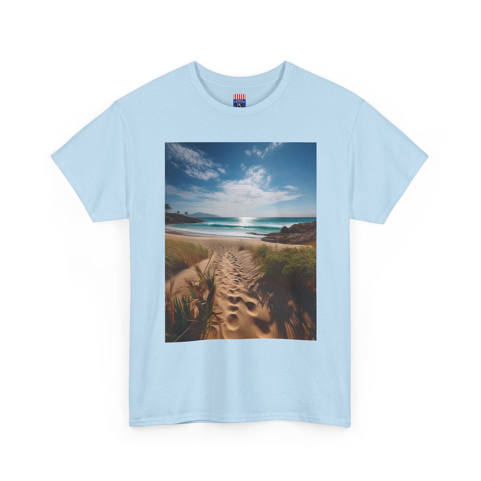 Step into serenity with the front design, featuring a picturesque sandy pathway winding through coastal greenery, leading to the glistening ocean horizon. This calming and timeless image captures the essence of tranquil beach escapes, letting you take a piece of paradise wherever you go.