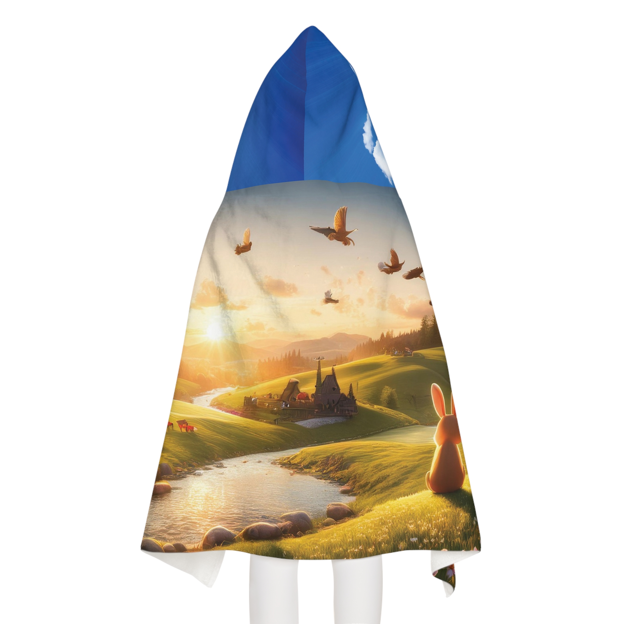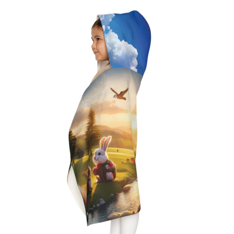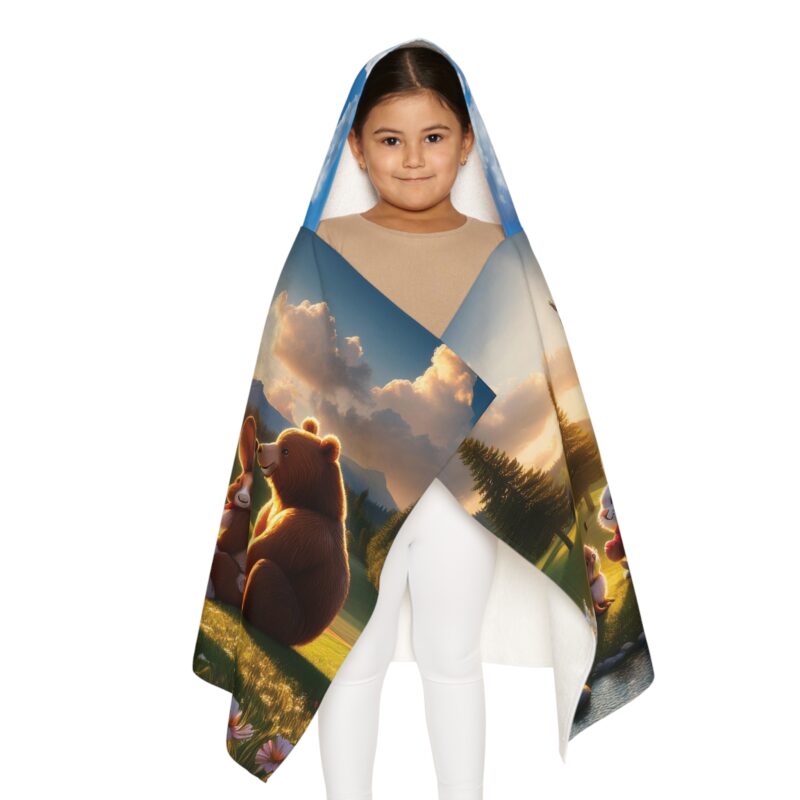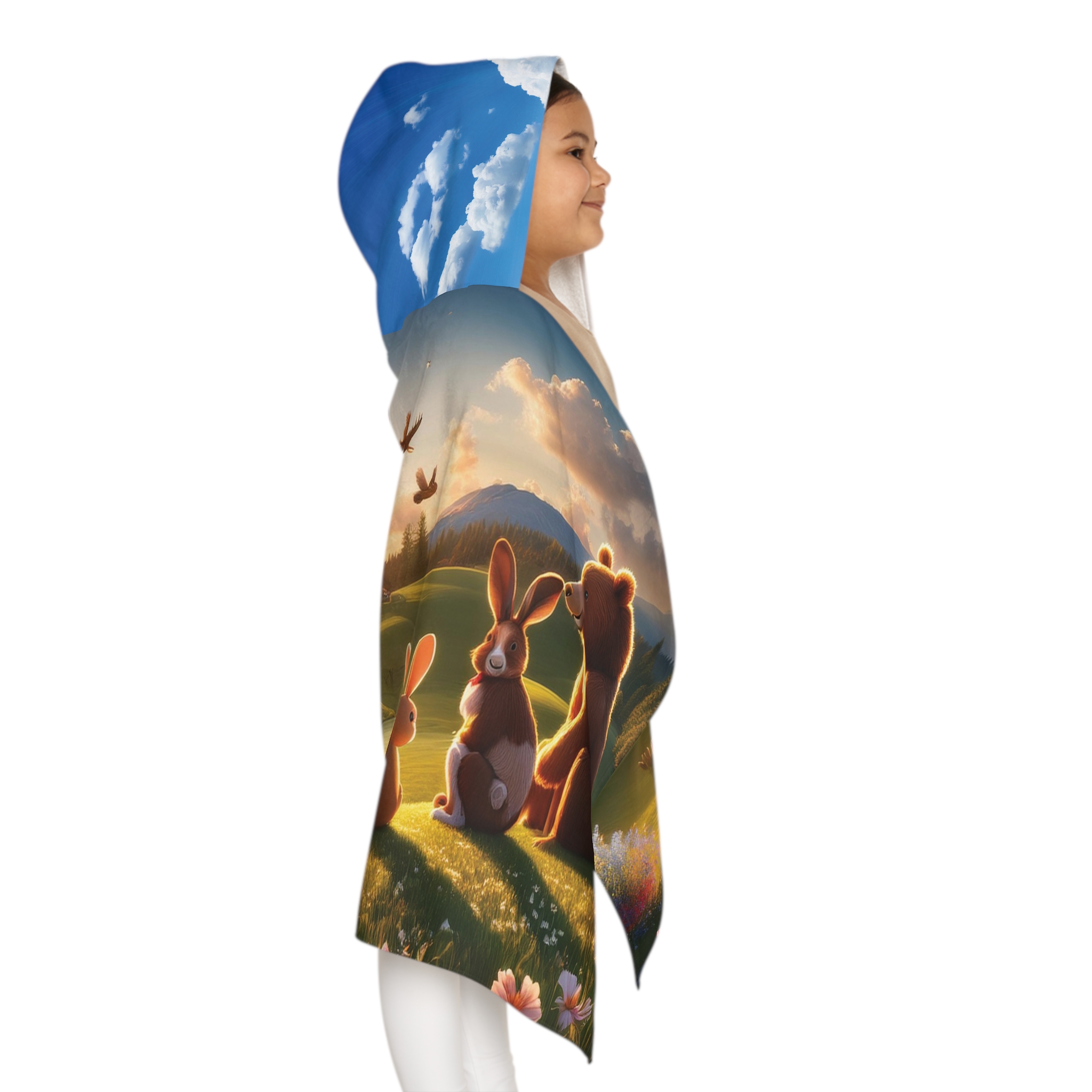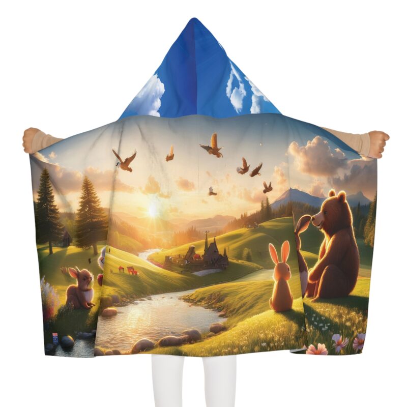 Wrap your little ones in a world of wonder with the “Golden Meadows” Kids’ Towel Hoodie. Featuring a heartwarming, cinematic scene of rolling green hills bathed in the glow of a setting sun, this towel turns bath time, beach days, or poolside fun into an enchanting adventure. From cuddly bunnies sharing love to a cheerful bear enjoying honey, and vibrant birds adding a touch of magic to the sky, this design is brimming with charm and personality.