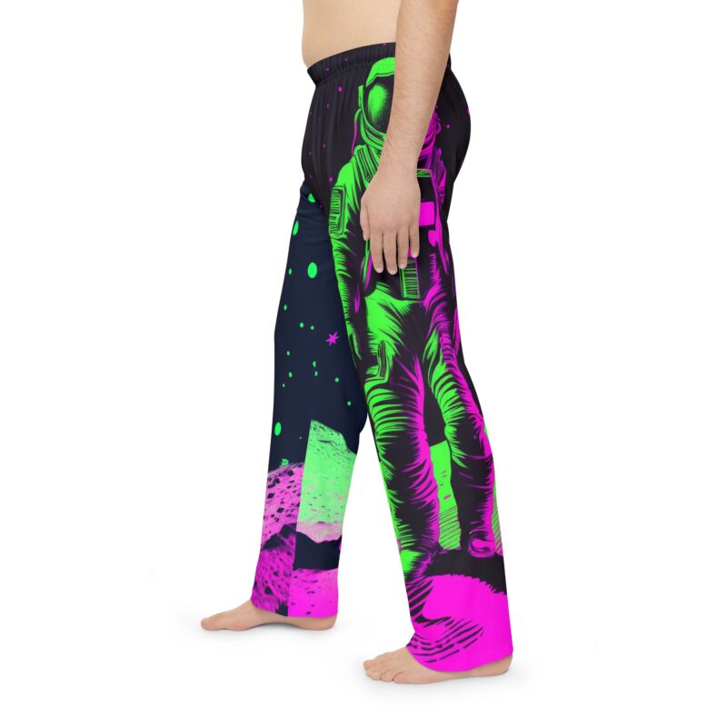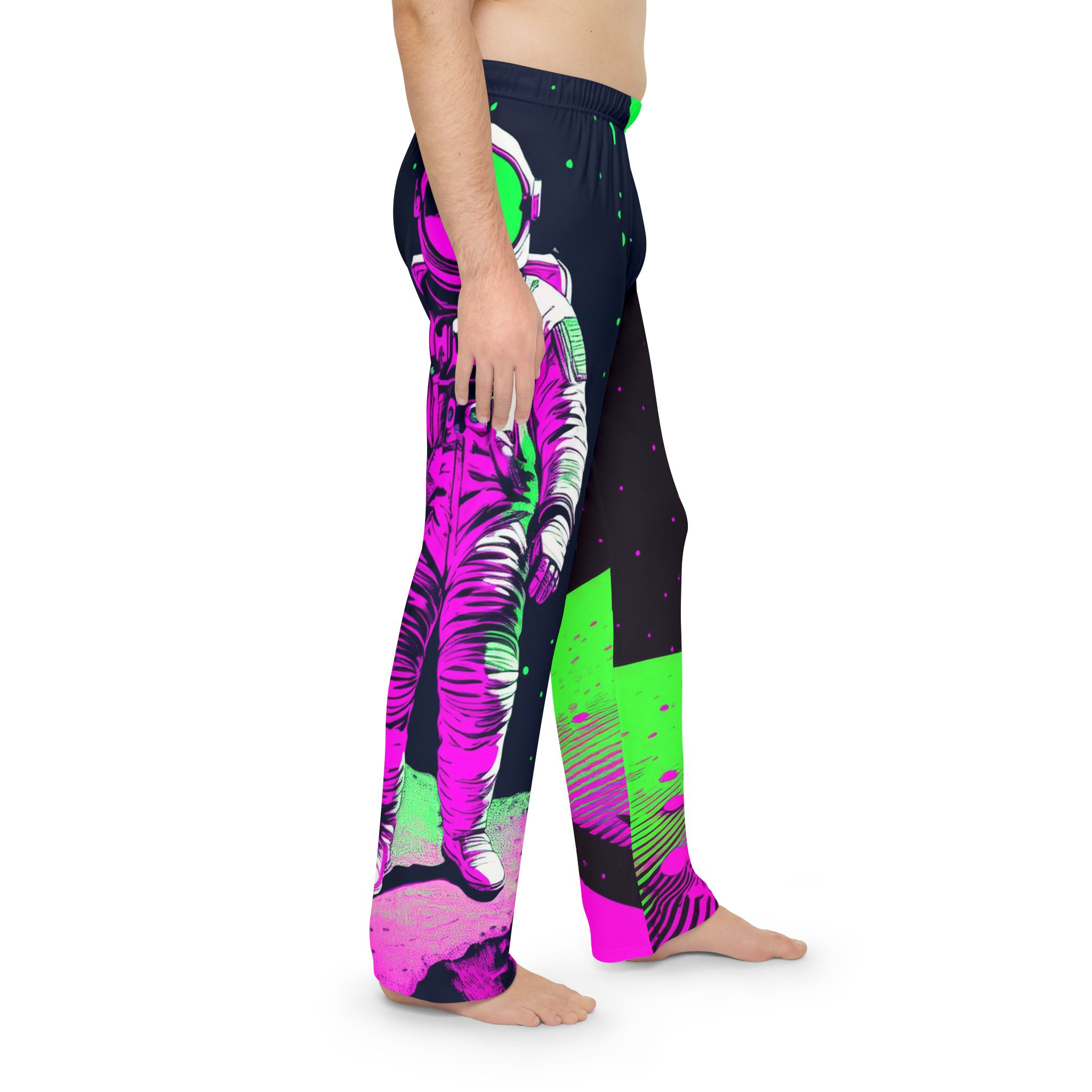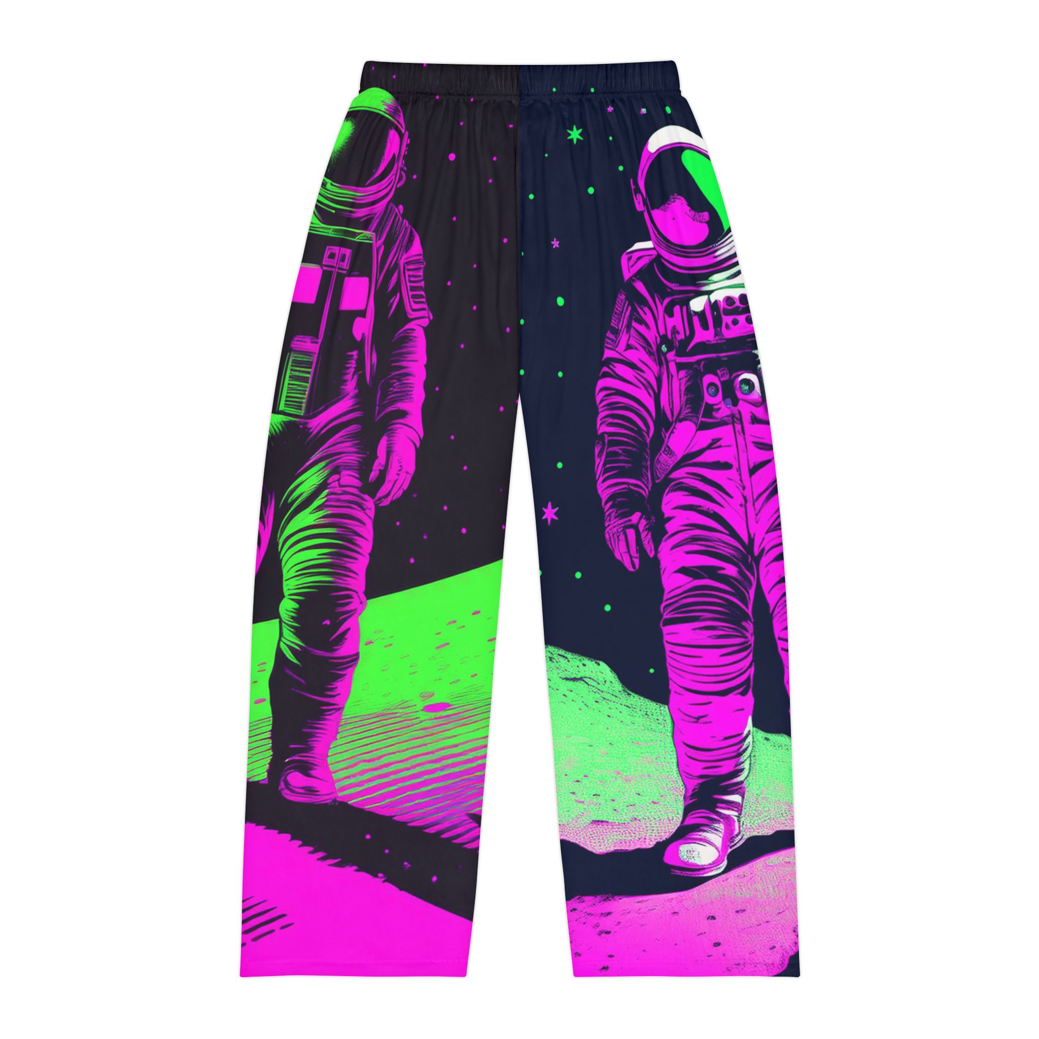 Take your downtime to another galaxy with the Neon Cosmos Pajama Pants, a bold fusion of retro-futuristic space aesthetics and modern comfort. Featuring an electrifying neon astronaut design in vibrant green, magenta, and deep black, this high-contrast print brings a sense of cosmic adventure with a cyberpunk twist.