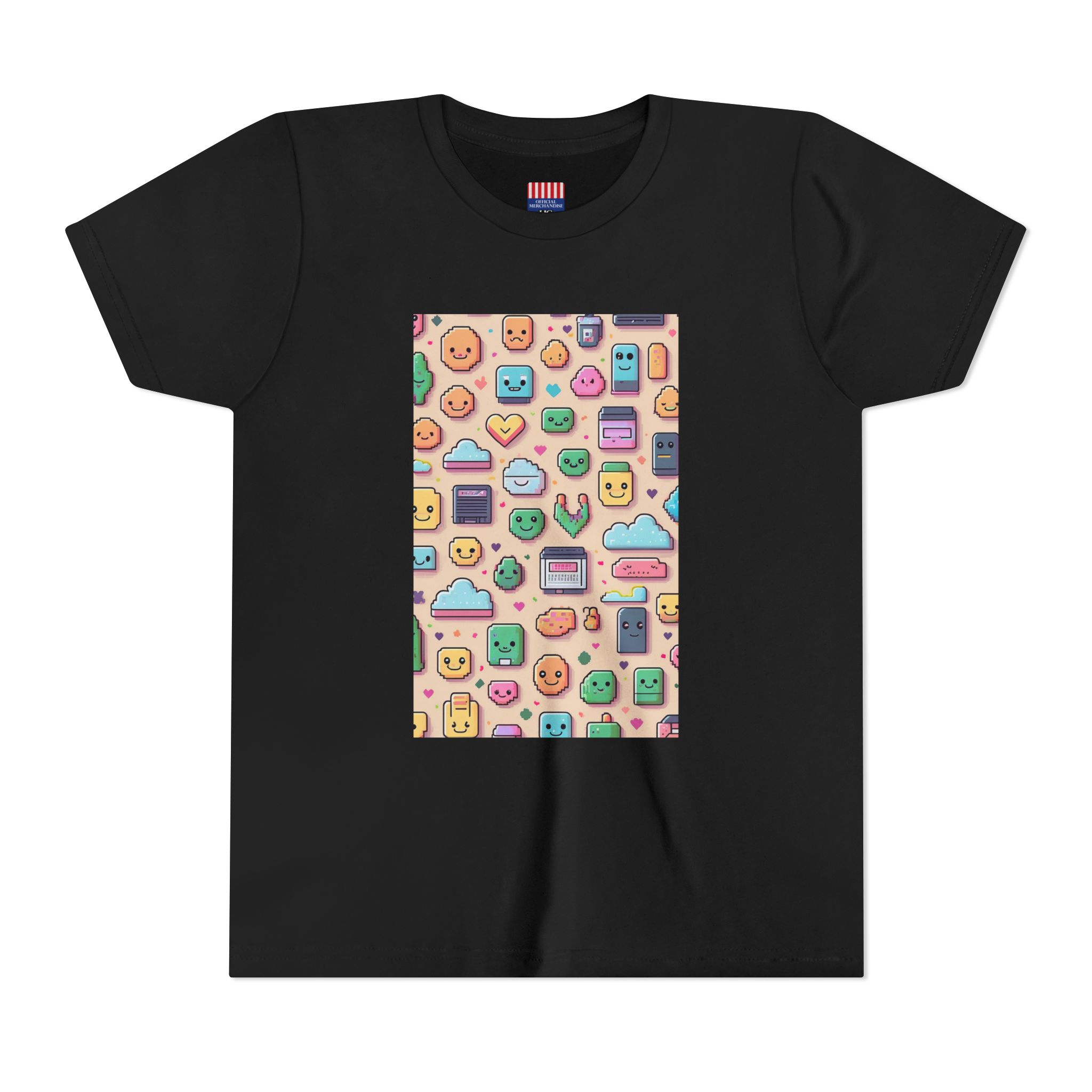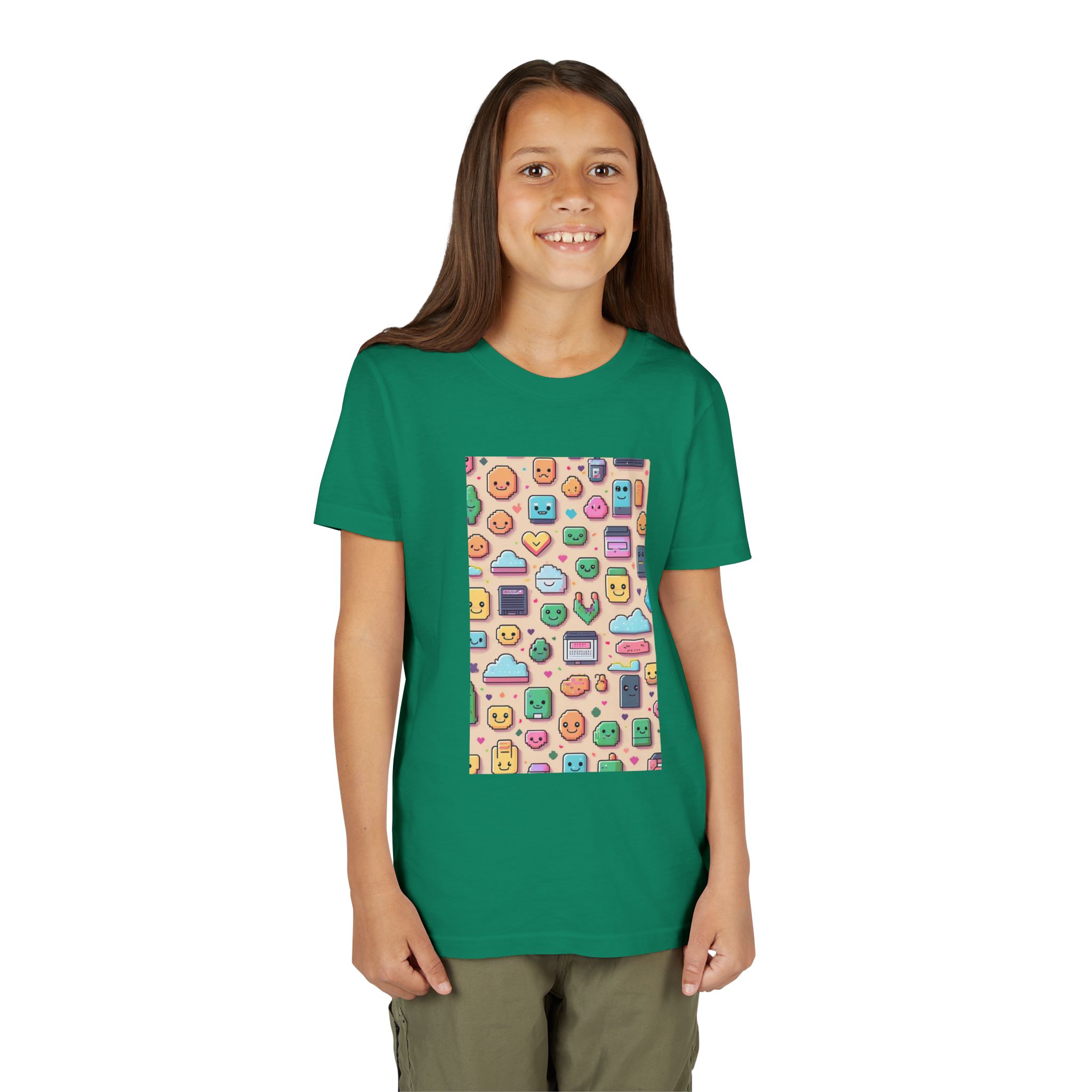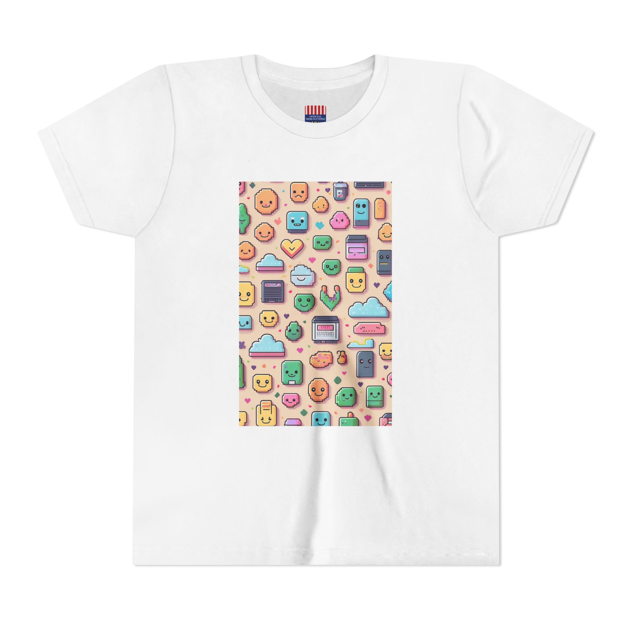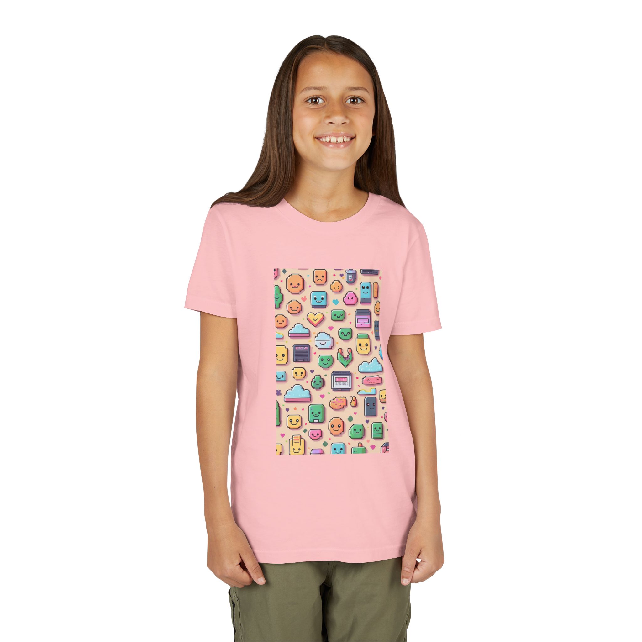 The Pixel Party Youth Tee is made for girls who love color, creativity, and comfy clothes. Featuring a playful grid of happy faces, hearts, clouds, and retro tech—this kawaii-inspired print brings good energy to any day.